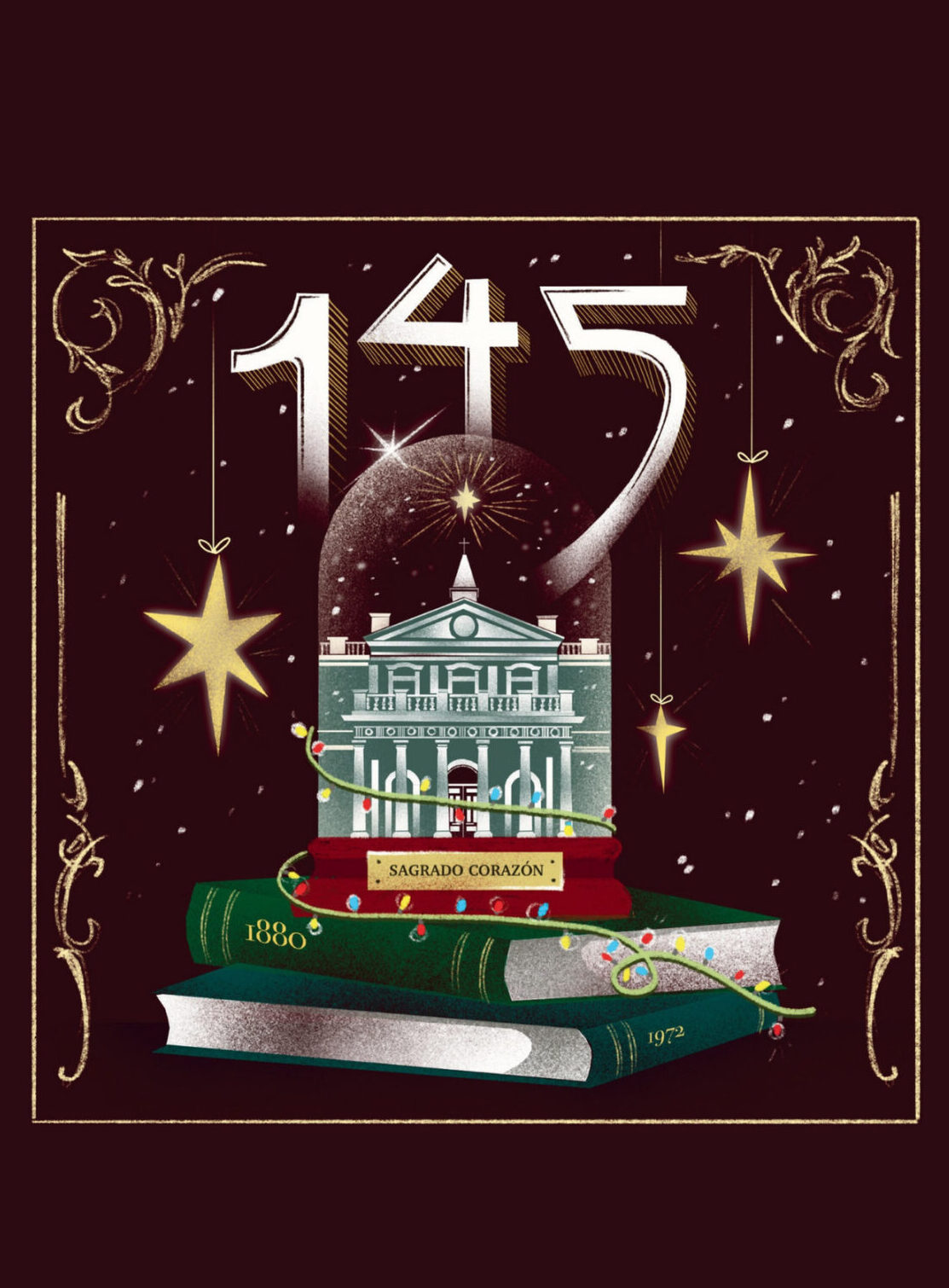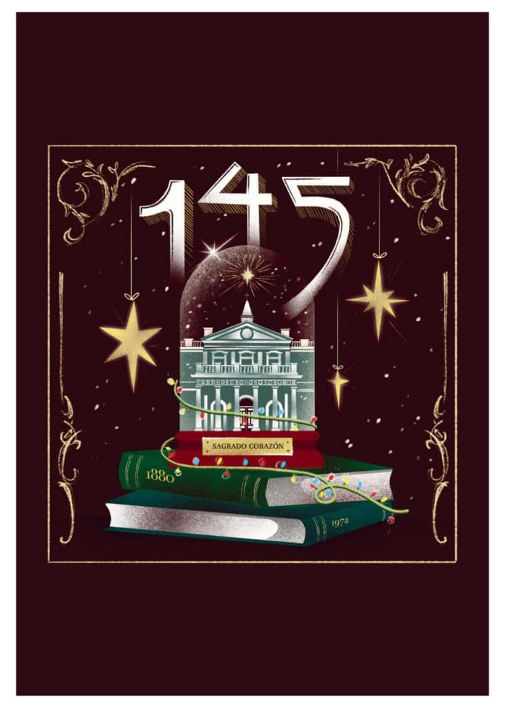 The artwork “Silent Night, Sacred Heart,” created by Viviana I. Báez Rico, depicts the Nativity within the university’s portico in an Art Nouveau style. Inspired by her love for art and the Christmas season, the piece seeks to convey serenity and share a sense of peace with the community.