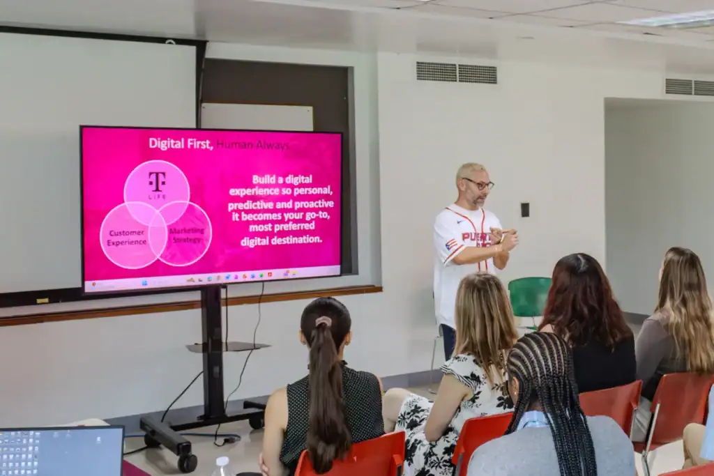 Durante la segunda parte del intercambio académico, los estudiantes lograron un vistazo hacia el panorama del mercadeo en el escenario local con Miguel Rojas, quien lidera la estrategia de mercadeo en T-Mobile Puerto Rico. Su participación abrió una conversación sobre posicionamiento de marca y estrategias generales en un nivel local, incluyendo un caso de estudio sobre las iniciativas que trabajó la marca durante la residencia histórica de Bad Bunny.