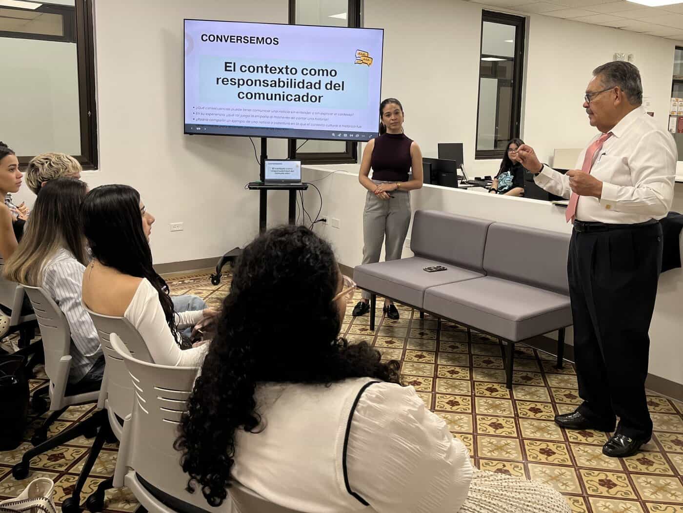 Como parte del curso GCM 110: Seminario de Lectura, estudiantes de la Universidad del Sagrado Corazón participaron en el conversatorio “Palabra y contexto: hacia un diálogo responsable”, junto al destacado periodista Jorge Rivera Nieves. La actividad, celebrada en el Centro de Idiomas, reunió a más de cuarenta estudiantes en una reflexión sobre la ética, la verdad y el compromiso social del periodismo.